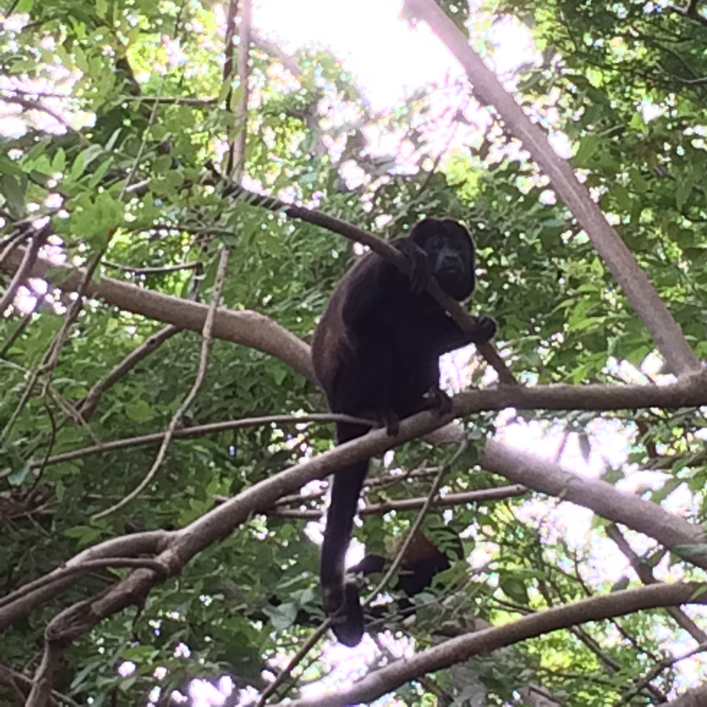 I spend the day pondering the various shades of green of the mango, avocado and lime trees. The branches of the tree the monkeys nest in almost touches the balcony. Mothers with babies and juveniles occupy the lower branches. At times they are only a few yards from me.  I feel like I am part of their family.  The dominant male of the troop naps high in the tree. The slightest disturbance sets off his distinctive howl.